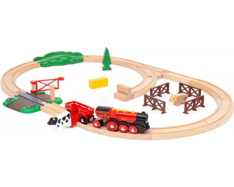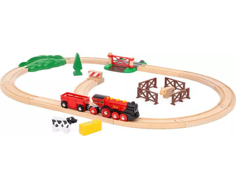 Stoere boerderijsfeer op de rails! De Mighty Red Train Set (36029) is een 24-delige BRIO-set met de populaire batterijloc “Mighty Red” (voor/achteruit, licht & geluid). Laad hooi, voer de dieren en rijd via kruising en panoramarail door het landschap. Compatibel met alle BRIO World banen.