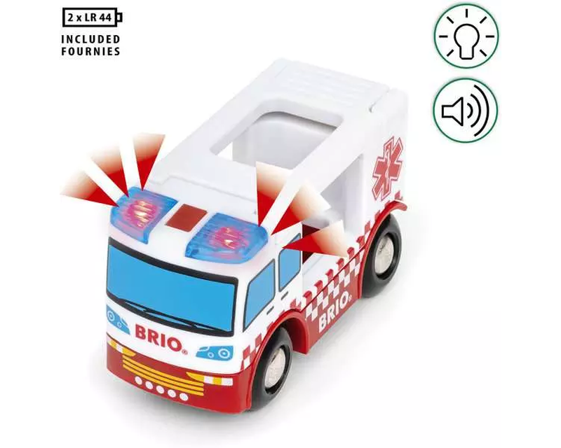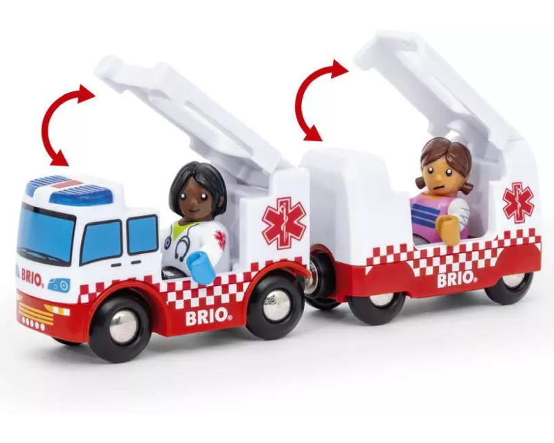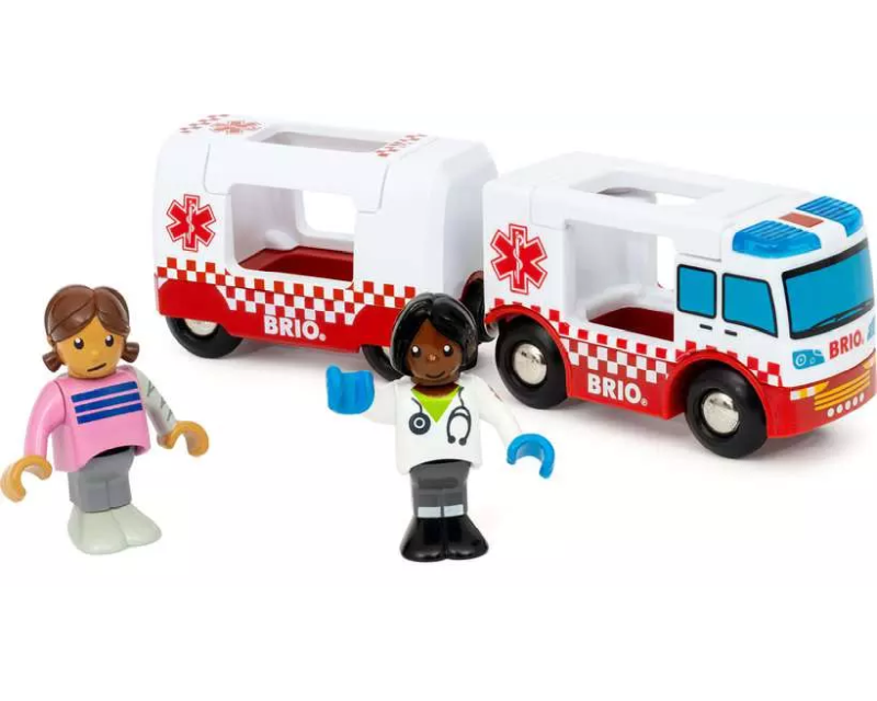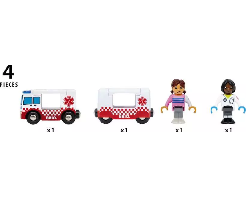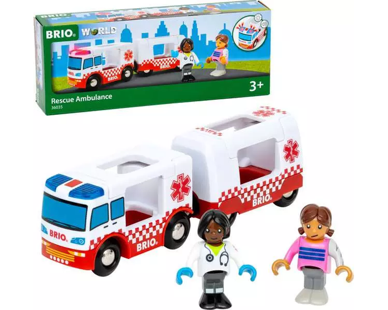 Er is een ongeluk gebeurd! Snel naar de plek van het ongeluk in de 36035 Ziekenwagen. Zet de ambulancebroeder achter het stuur en raas met gillende sirenes over de weg. Door de zwaailichten en de luide sirene weet iedereen dat de dokter onderweg is. Help de gewonde achter in de ziekenwagen en breng hem veilig terug naar het ziekenhuis voordat de volgende reddingsactie begint. Over BRIO World: BRIO World is ons open speelsysteem dat met je kind meegroeit. Al het BRIO World speelgoed kan met elkaar worden gecombineerd voor een volledig aanpasbare wereld die de creativiteit van kinderen stimuleert. Er zijn eindeloos veel combinaties van fantasierijke spelletjes te bedenken, en deze accessoire voor de treinset past daar perfect bij – pak gewoon een item en begin met bouwen. 36035 Ziekenwagen bestaat uit 4 delen: 1x ziekenwagen, 1x ziekenwagen met aanhanger voor patiënten, 2x speelfiguur.
